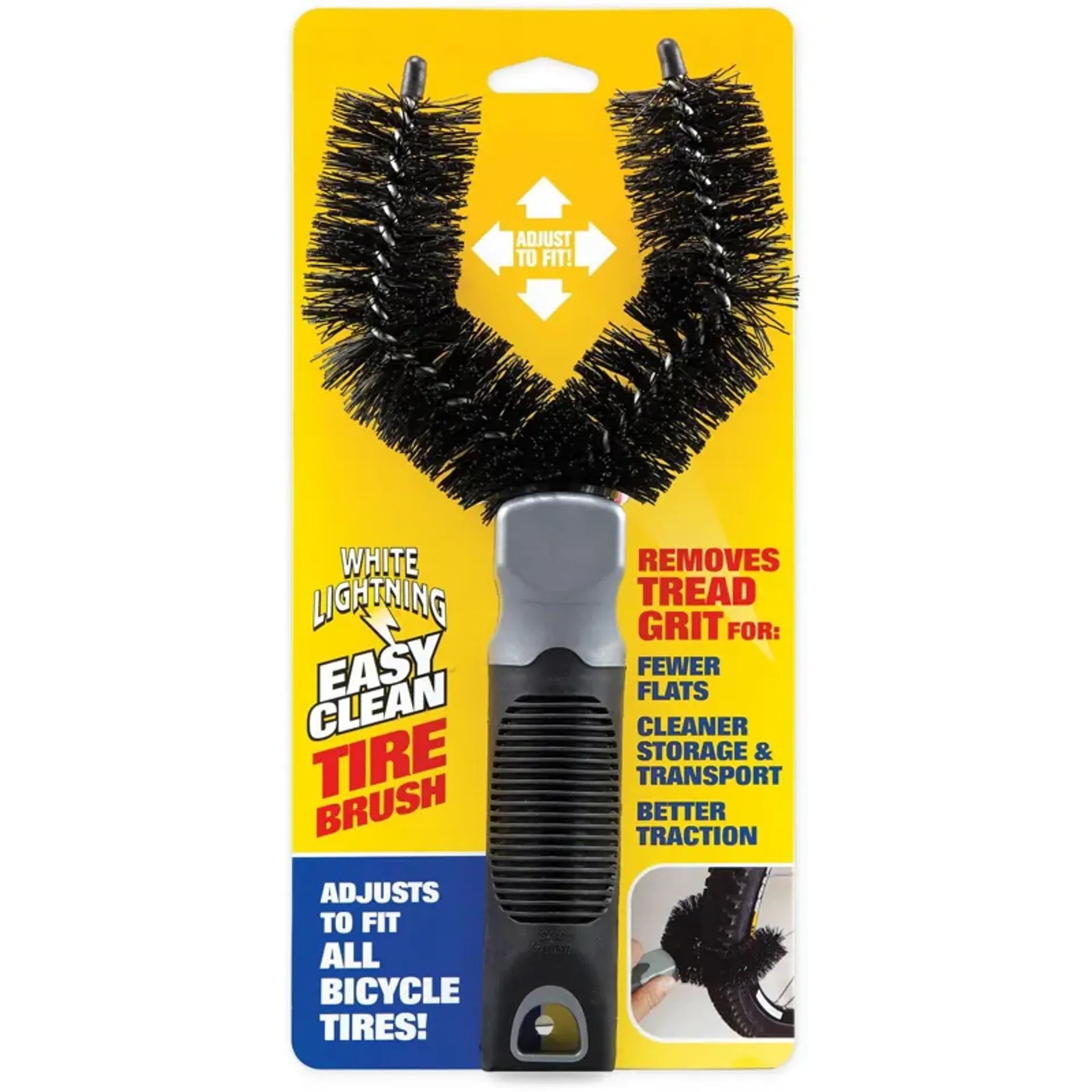 The White Lightning Easy Clean Tire Brush? is the perfect solution for cleaning dirty tires. The Tire Brush removes tread grit, which improves traction, helps to prevent flats, and minimizes soils when storing or transporting bikes.