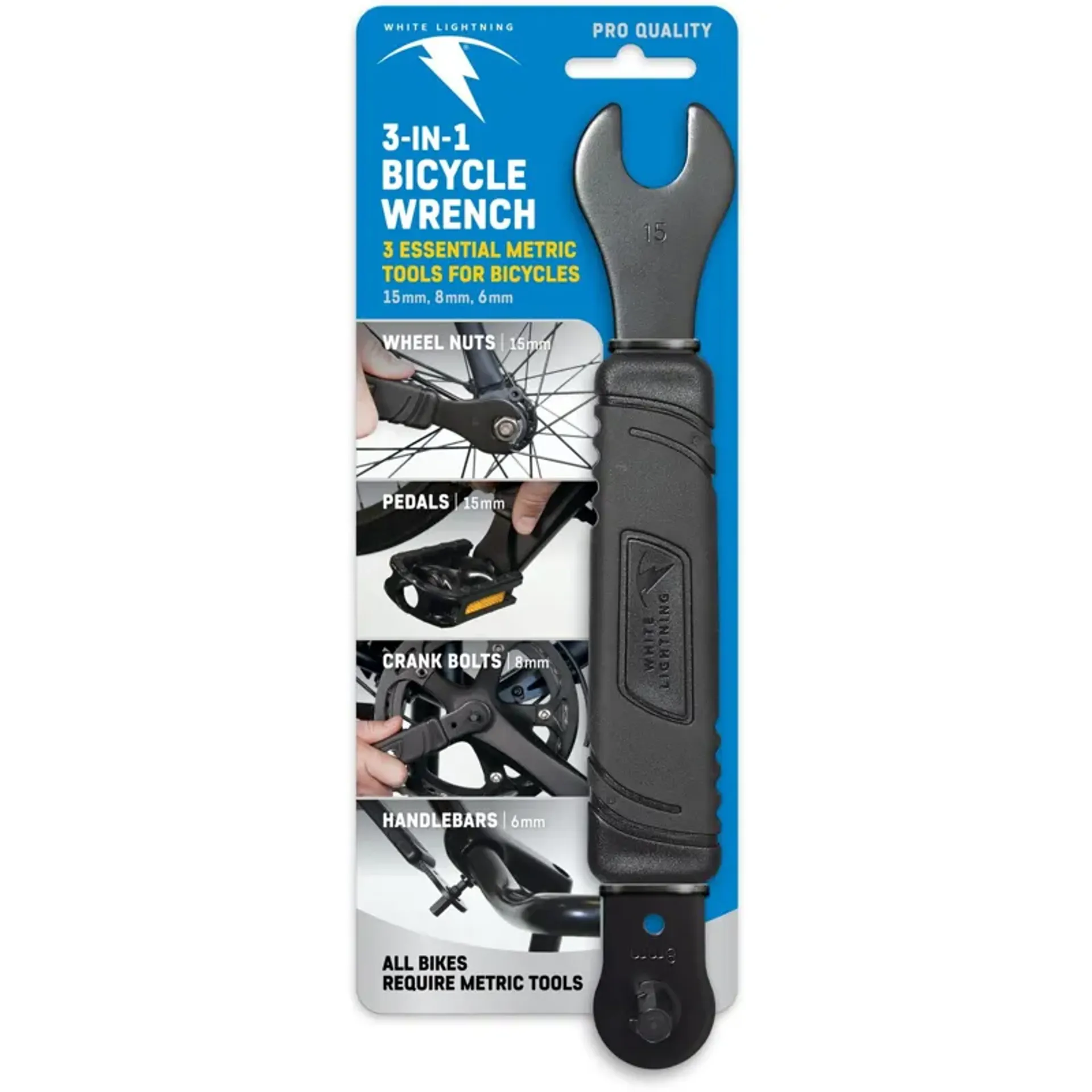 This mechanic quality tool includes a 15mm spanner wrench for wheel nuts and pedals, an 8mm hex wrench for crank bolts and a 6mm hex wrench for handlebars and pedals. The rubberized grip offers comfort and control. 9-inch length provides ideal torque and leverage.